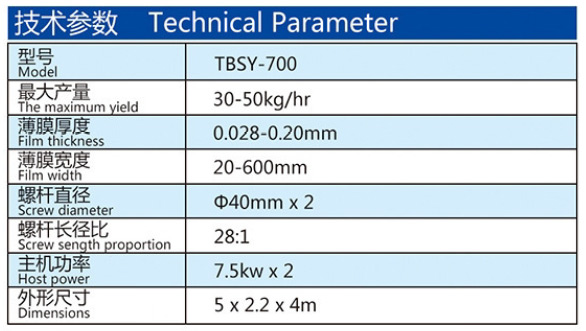 機器特性 吹制各種規格的低密度聚乙烯、高密度聚乙烯和線性低密度聚乙烯塑料薄膜,廣泛應用于食品百貨、日用、化工、針紡品、購物禮袋和工業包裝。機筒、螺桿采用38CrMoAl合金材料經氮化處理精密加工而成