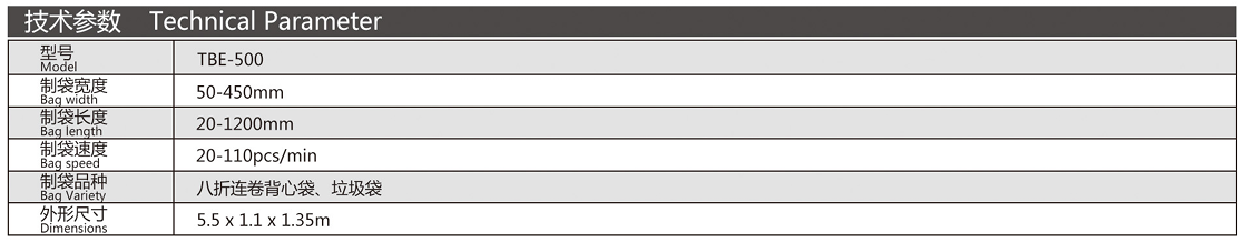 機器特性 該機電腦控制,高位停車,自動放料,是生產垃圾袋、八折連卷背心袋、S型袋的理想設備。